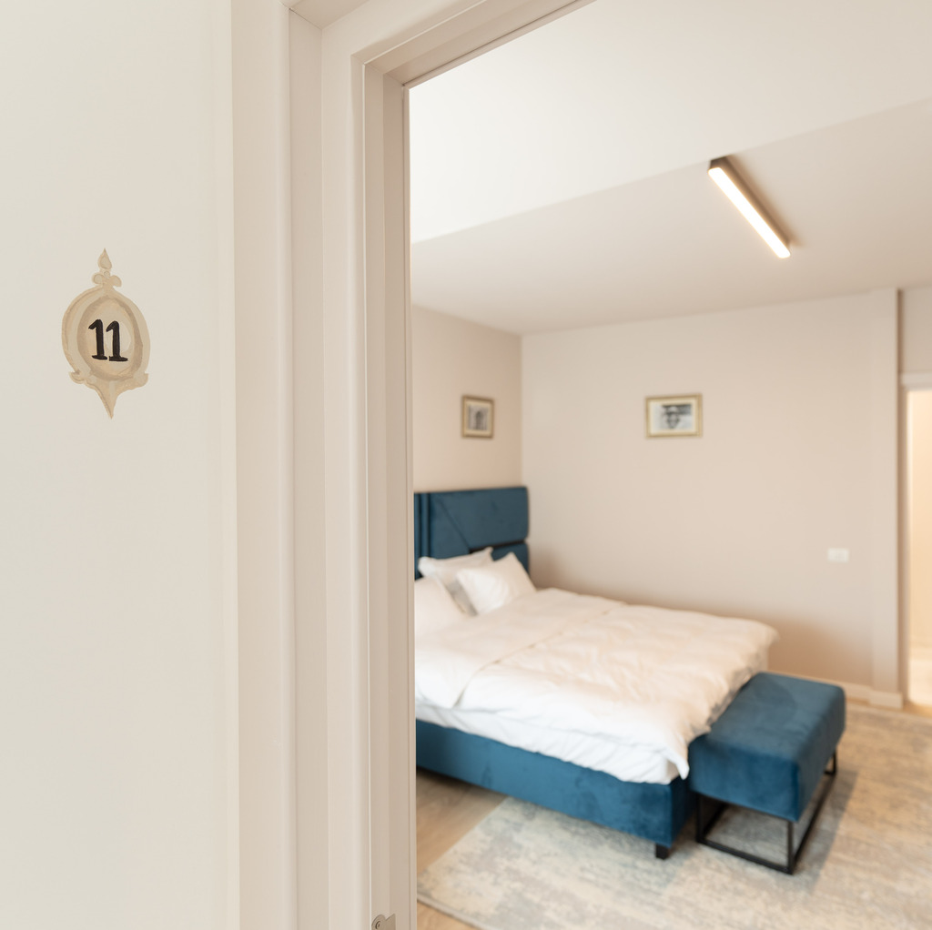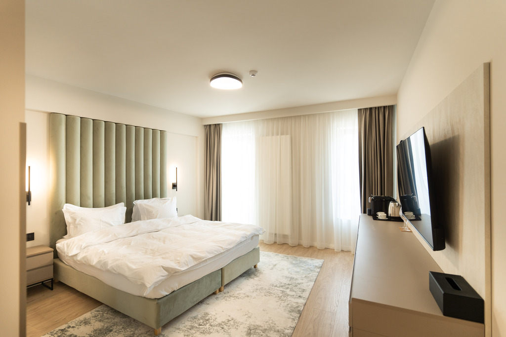 The hotel room, measuring 25 square meters, is a modern retreat located in the heart of Constanța. Upon entering, you are greeted by a bright and airy atmosphere, thanks to large windows that offer an impressive view of the main boulevard. The room features a stylish design with a contemporary color palette of soft neutrals and pops of color.