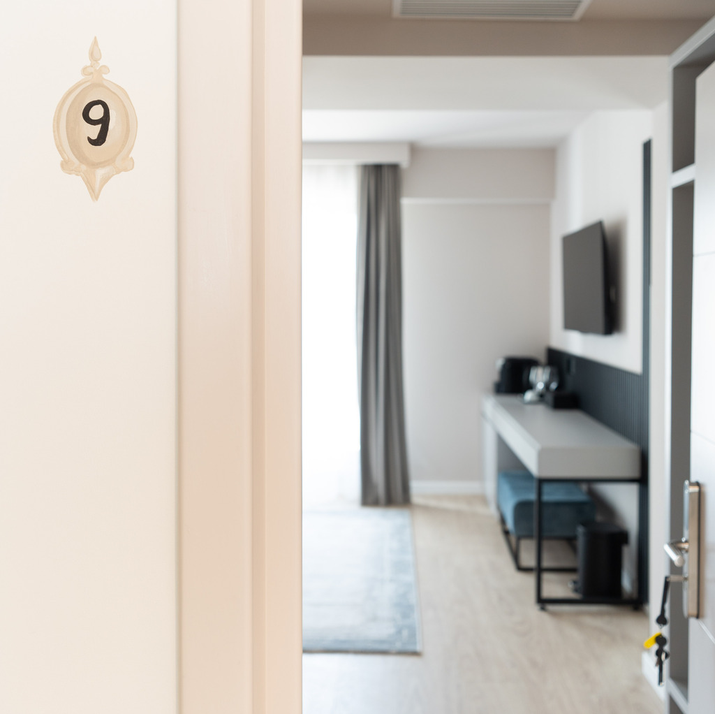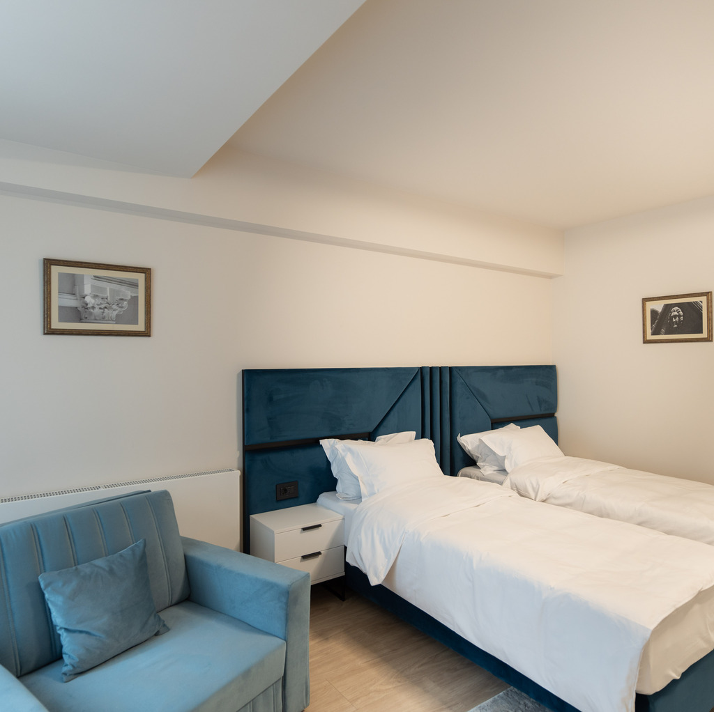 The budget twin hotel room encompasses 25 square meters and is designed with a modern, functional layout that makes the best use of the space available. Upon entering, you will find two cozy twin beds positioned side by side, each dressed in fresh, crisp linens and equipped with individual bedside tables and lamps, creating a warm and inviting atmosphere, an extendable armchair is thoughtfully placed in the corner of the room, providing an additional bed option for guests.