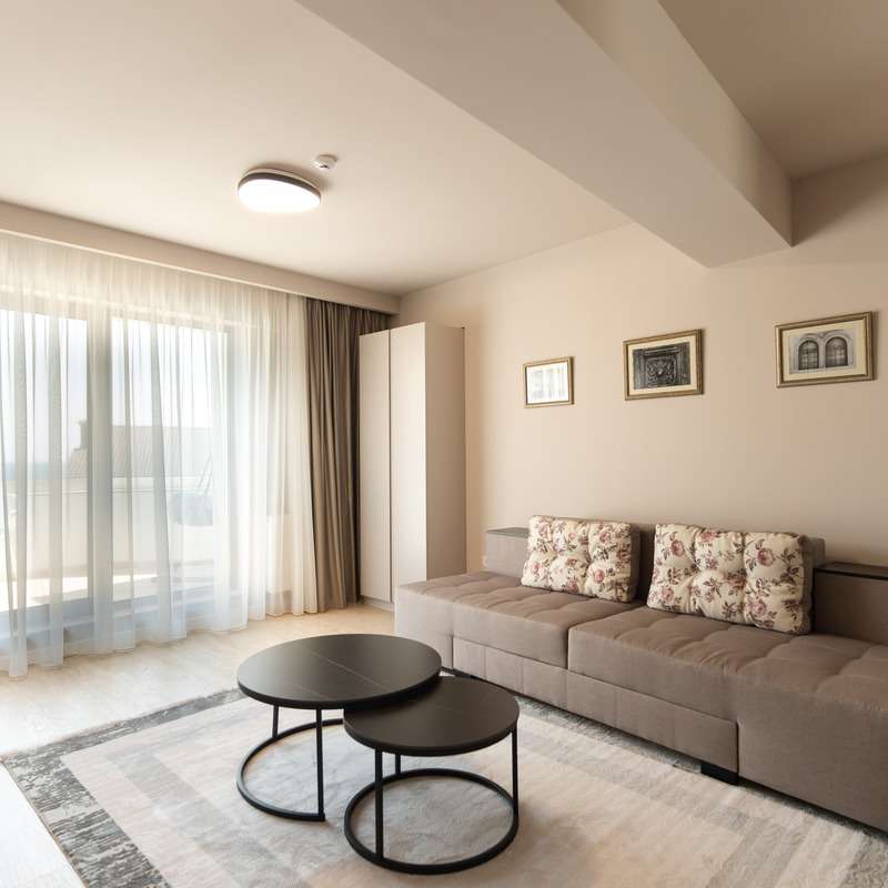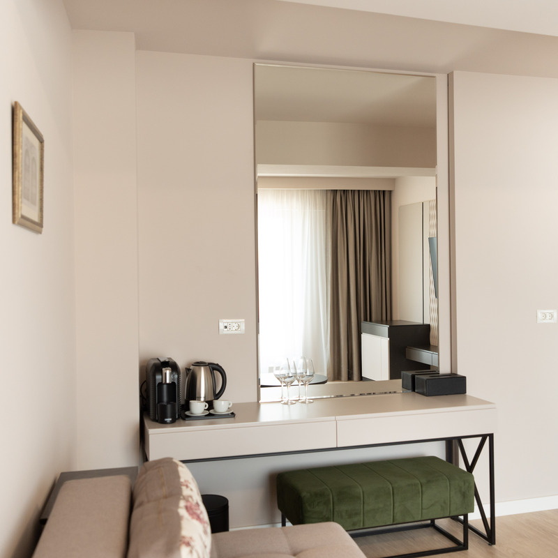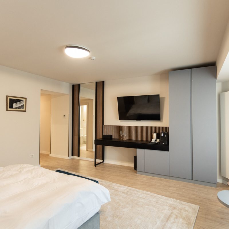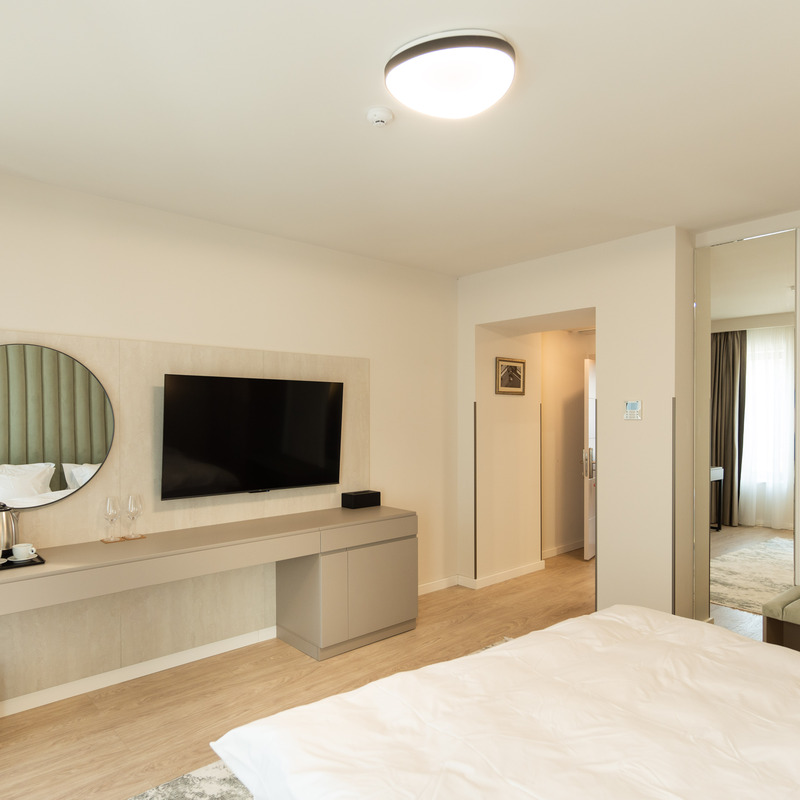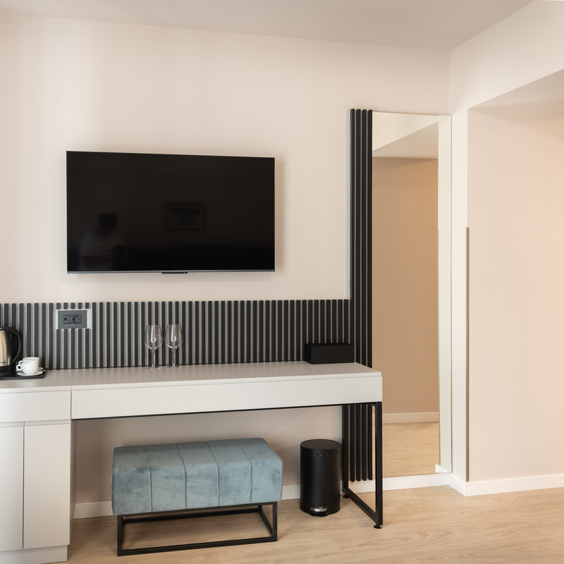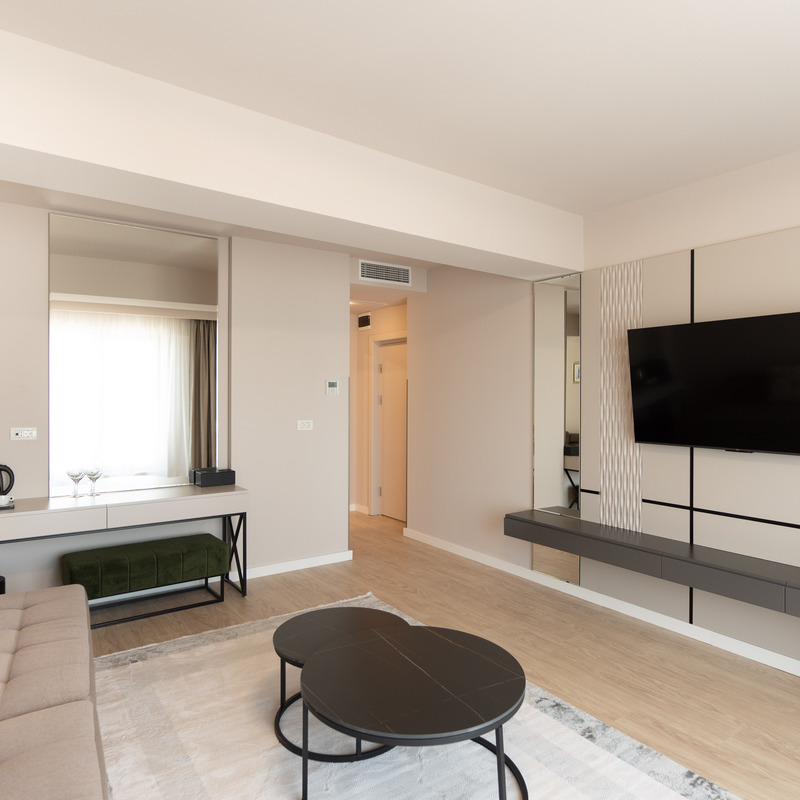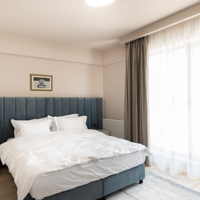 The hotel room, measuring 25 square meters, is a modern retreat located in the heart of Constanța. Upon entering, you are greeted by a bright and airy atmosphere, thanks to large windows that offer an impressive view of the main boulevard. The room features a stylish design with a contemporary color palette of soft neutrals and pops of color.