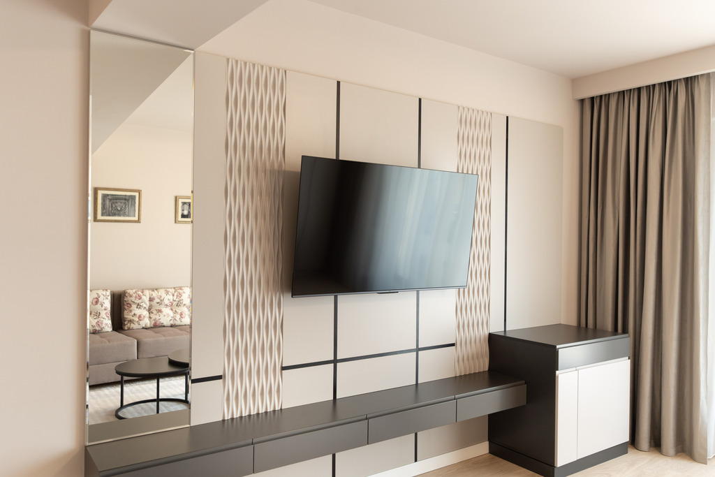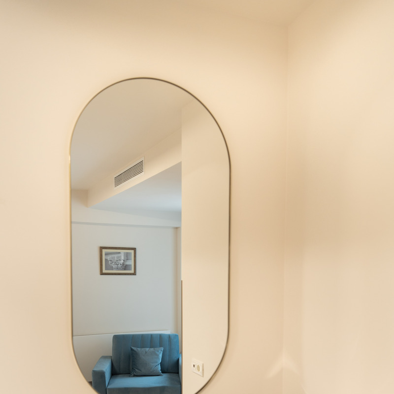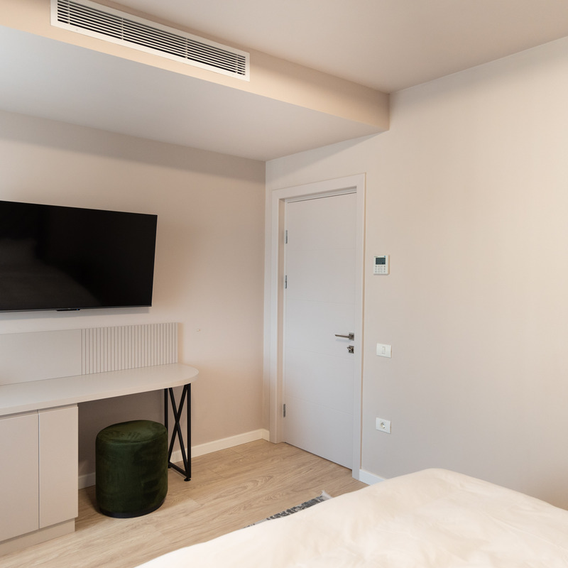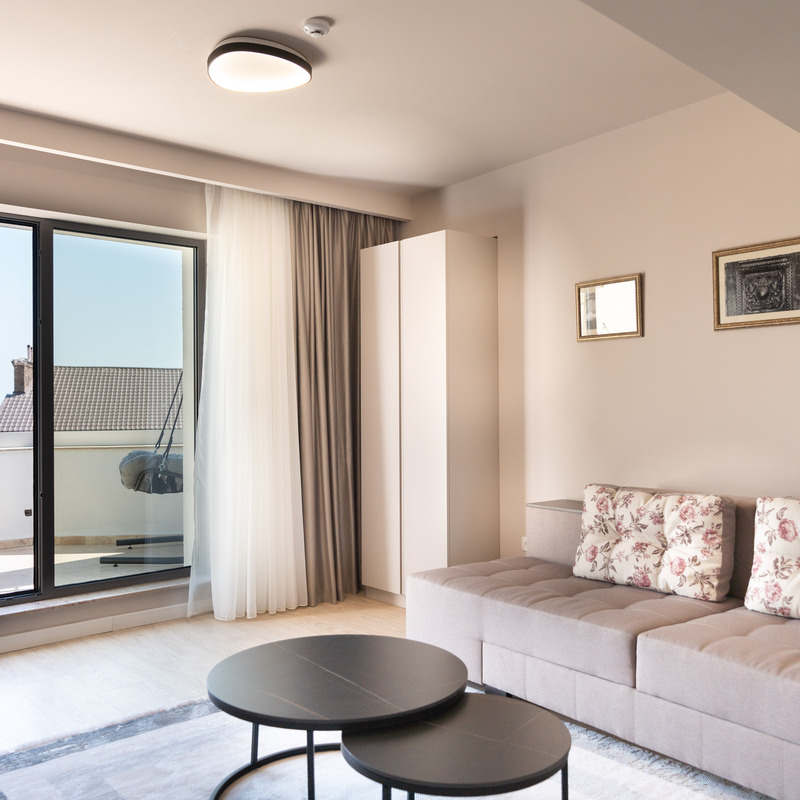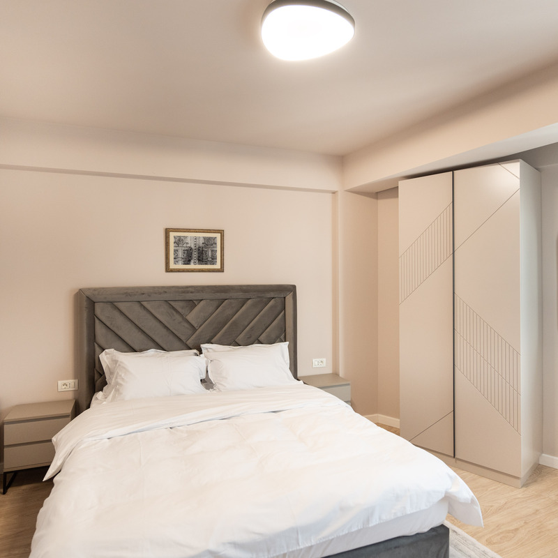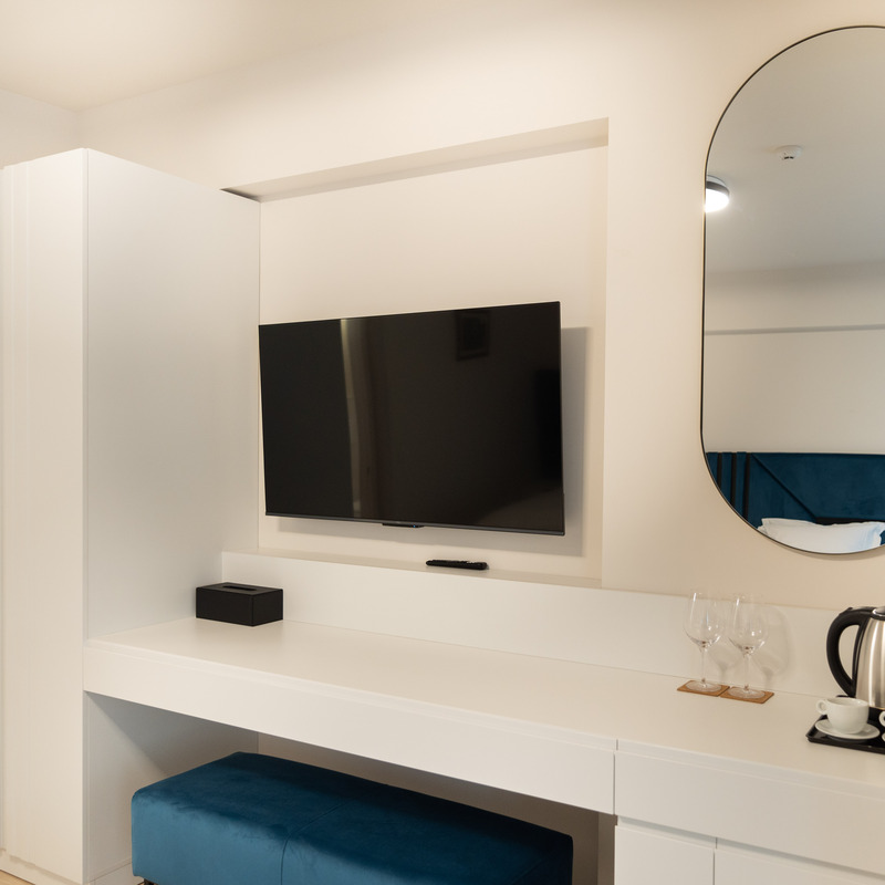 The hotel room, measuring 25 square meters, is a modern retreat located in the heart of Constanța. Upon entering, you are greeted by a bright and airy atmosphere, thanks to large windows that offer an impressive view of the main boulevard. The room features a stylish design with a contemporary color palette of soft neutrals and pops of color.
