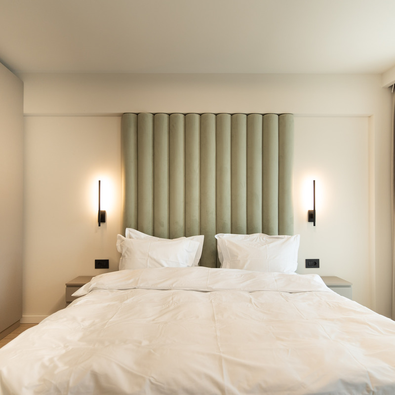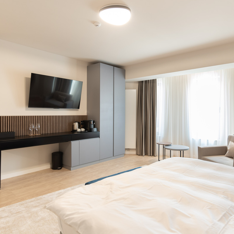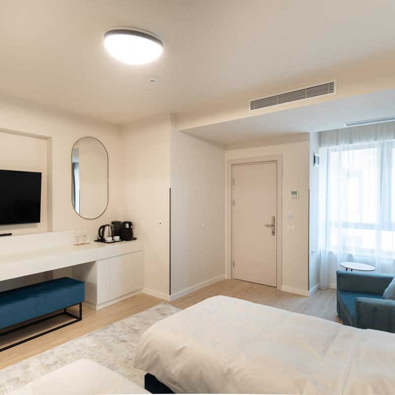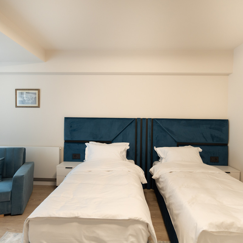 The budget twin hotel room encompasses 25 square meters and is designed with a modern, functional layout that makes the best use of the space available. Upon entering, you will find two cozy twin beds positioned side by side, each dressed in fresh, crisp linens and equipped with individual bedside tables and lamps, creating a warm and inviting atmosphere, an extendable armchair is thoughtfully placed in the corner of the room, providing an additional bed option for guests.