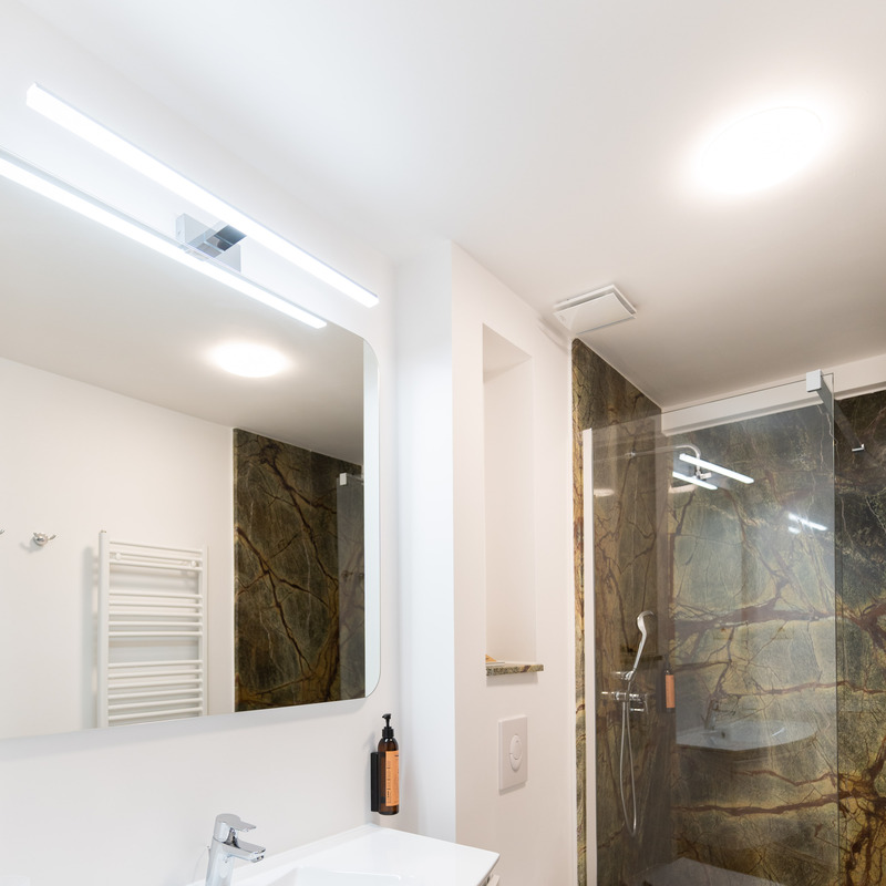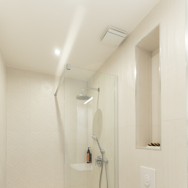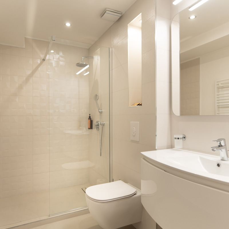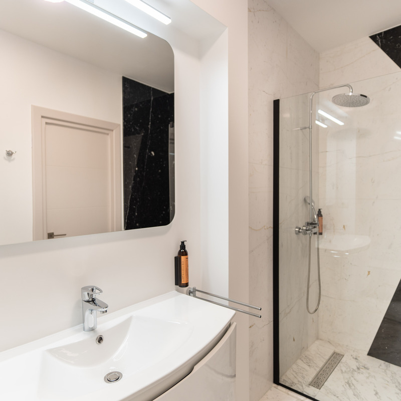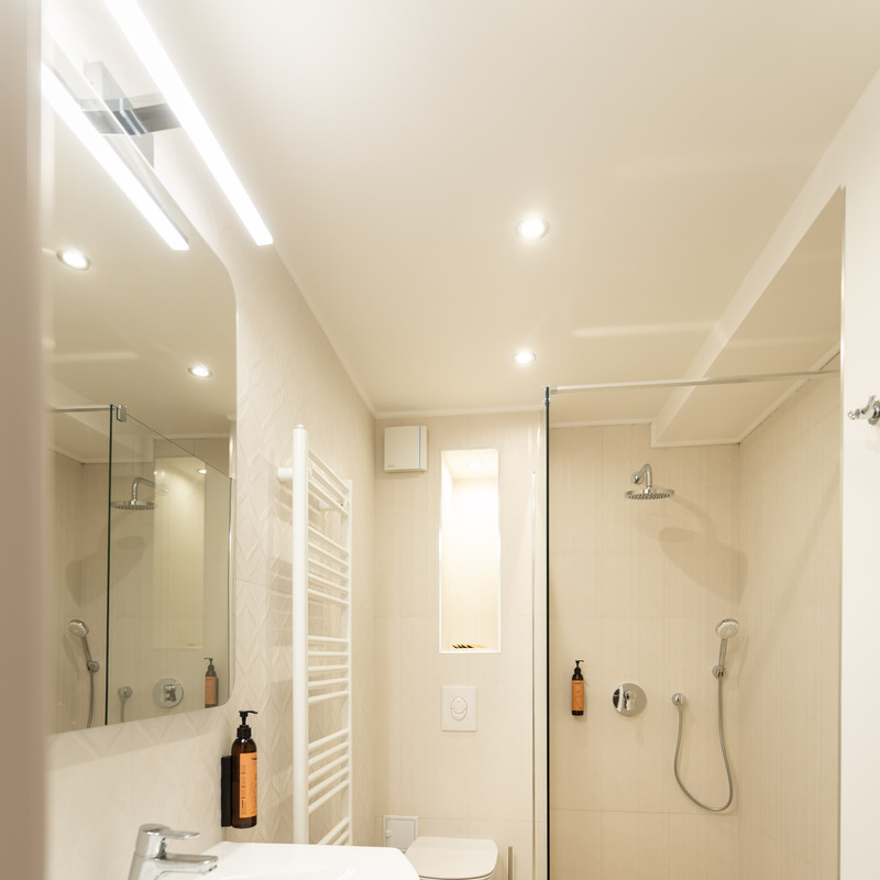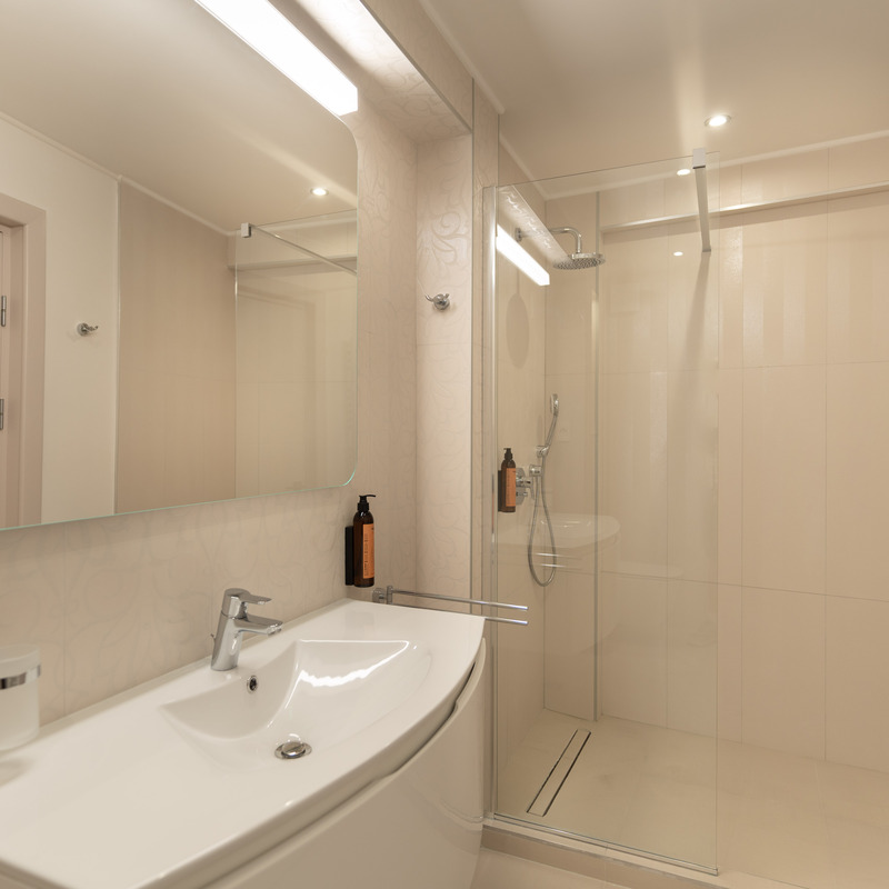 The en-suite bathroom is compact but stylish, featuring a walk-in shower with modern fixtures, a clean sink area, and complimentary toiletries. Soft towels and a hairdryer are provided for convenience.