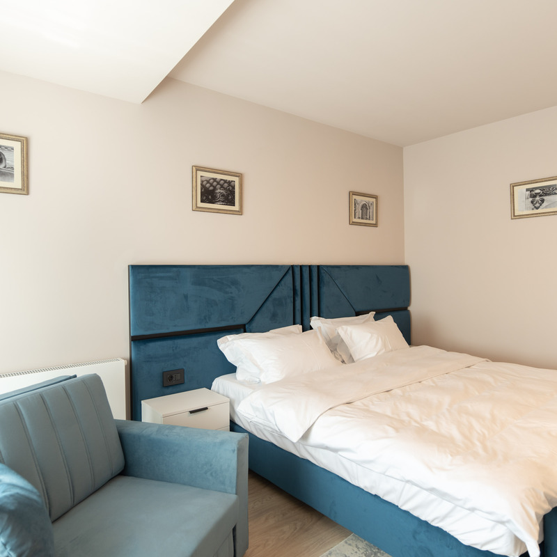 The budget hotel room encompasses 25 square meters and is designed with a modern, functional layout that makes the best use of the space available. Upon entering, you will find one cozy king-size double bed dressed in fresh, crisp linens and equipped with individual bedside tables and lamps, creating a warm and inviting atmosphere, an extendable armchair is thoughtfully placed in the corner of the room, providing an additional bed option for guests.