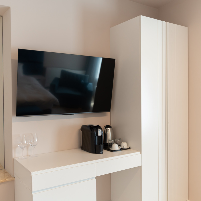 Adjacent to the bed, a cozy seating area with modern armchairs allows guests to relax while taking in the lively sights and sounds of the boulevard below. A flat-screen TV mounted on the wall provides entertainment options, and minimalistic decor enhances the modern feel without cluttering the space.