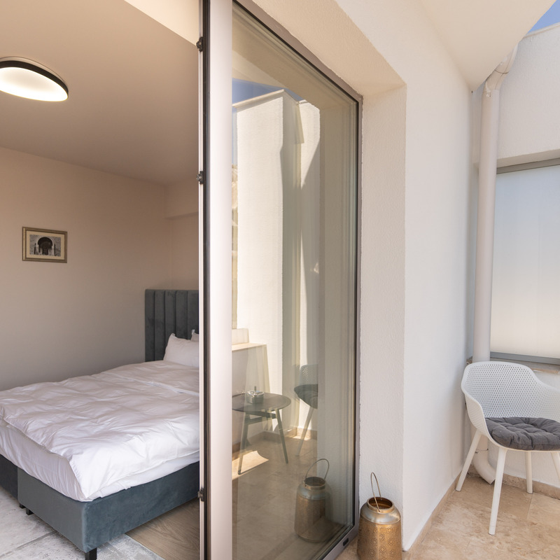 This 20 sqm hotel room with a king-size bed and sea view balcony offers a perfect blend of comfort and elegance. The thoughtful layout maximizes space, while the carefully chosen furnishings and decor create a serene and inviting environment, ideal for relaxation and rejuvenation.